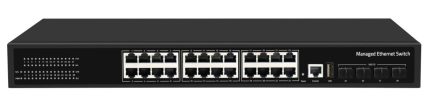 28-Port Managed Gigabit Ethernet Switch, black iron shell design, built-in DC 12VPower supply, light and simple, with LED indicator on the panel, can dynamically display the connection and operation of equipment, provide simple fault detection methods, and facilitate maintenance and management; this series of switches provide advanced network management functions: redundant ring network, VLAN, cluster, QoS, speed control, port image, fault alarm and firmware online upgrade. The adaptive port can automatically adapt to the 10m, 100m and 1000m networks, and can automatically adapt to the full duplex or half duplex mode; the MAC address self-learning function ensures error free data transmission; the store and forward mode prevents the damaged packets from flooding in the network; the flow control function can prevent the impact of a large amount of instantaneous data on the network; the port supports MDI/ Mdix auto flip function, non-blocking line speed transmission of all ports.It is mainly located in the core or convergence layer of user networks such as industrial parks, buildings, factories and mines, government agencies, community broadband,etc.; it can be widely used in Ethernet access scenarios such as small and medium-sized enterprises, Internet cafes, hotels, schools, etc1. Support 24* Gigabit Ethernet Ports+ 4* Gigabit SFP Ports+1* Console Port2. SupportIEEE802.3, IEEE802.3i, IEEE802.3u, IEEE802.3ab, IEEE802.3z, Storage and forwarding3. Ethernet ports support 10/100/1000M adaptive4. Adopt store-and-forward switching mechanism5. Fanless design, natural Cooling, 1U Rack Mount6. Support 802.1x port authentication, support AAA authentication, support TACACS + authentication7. Support WEB, TELNET, CLI, SSH, SNMP, RMON managementDatasheet