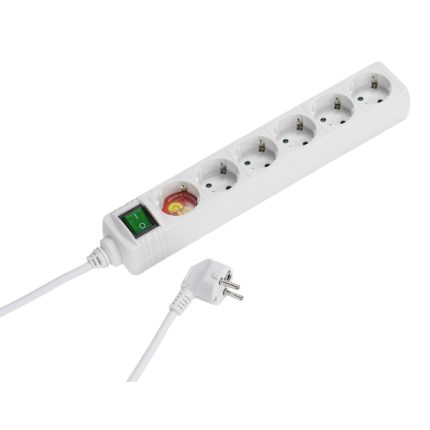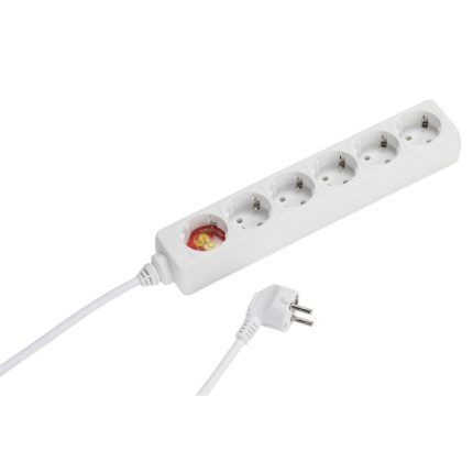 Strip power strip with 6 Schuko sockets, ideal for safely connecting multiple devices. The sockets are rotated 45° for greater convenience, with stable contacts and 1.5 mm² cable. Cable length: 1.4 m. Power strip equipped with a switch. 6 Schuko sockets On/off switch Schuko plug Cable length: 1.4 m White color Sockets rotated 45° for convenience and safety, 1.4 m cable