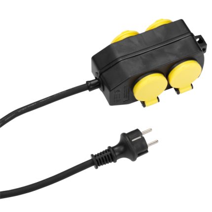 Outdoor power strip designed for safe outdoor use. IP44 certified, it offers protection against splashes of water and sand. Equipped with 4 Schuko sockets, each with a Schuko connection, sockets rotated 45°, a 1.4 m rubber cable (type H07RN-F3G 1.5 mm²), and suitable for a voltage of 220–240V / 50Hz. It supports a maximum current of 16A / 3680W and operates within a temperature range of -10°C to +40°C. * 4 Schuko sockets Safety switch Schuko plug Cable length: 1.4 m * IP44 protection, durable cable, ideal for harsh outdoor conditions