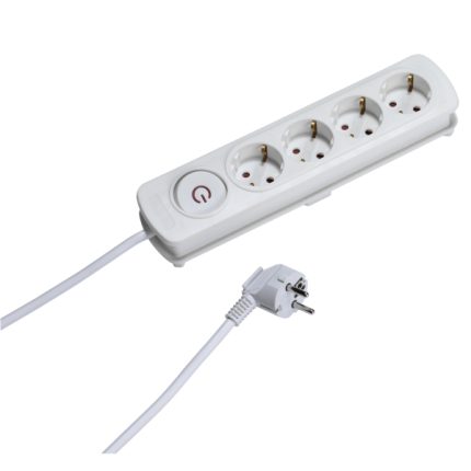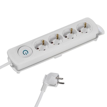Schuko power strip with 4 Schuko sockets, ideal for safe and convenient use. The sockets, arranged at a 45° angle, offer greater convenience when connecting. The 4-meter cable has a cross-section of 1.5 mm² and is equipped with a switch. 4 Schuko sockets Safety switch Schuko plug Cable length: 4 m White color 45° angled design for more comfortable and secure connections