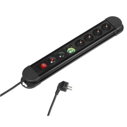 * 6way power socket with switch * Extra large round on-off switch * Rugged, unbreakable plastic housing * Children security * Wall-mountable * 16A / 3.680W / 50Hz * Color: black * Length: 1.4 m