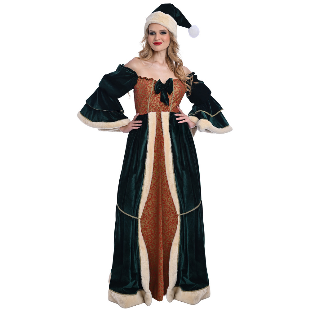 Η Χριστουγεννιάτικη στολή αποτελείται από: Φόρεμα με εσωτερική Φούστα και Καπέλο. Το Φόρεμα είναι φτιαγμένο από βαθύ Πράσινο Βελούδο και Μπορντό-Χρυσό Μπροκάρ, διακοσμημένο με απαλή Μπεζ Γούνα στα τελειώματα. Το επάνω μέρος έχει σχέδιο που αφήνει τους ώμο