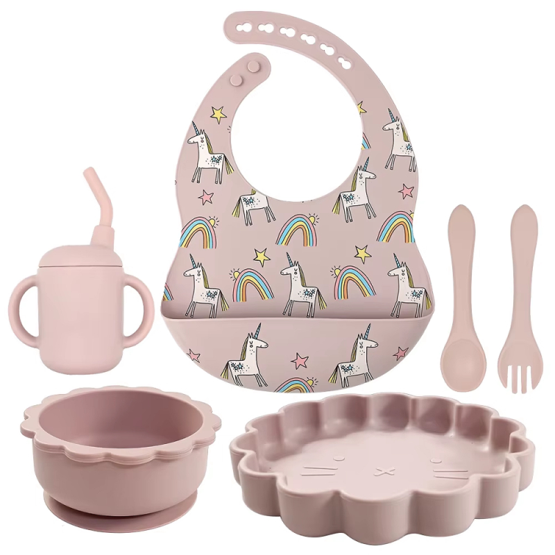 Giggles and Co. Βρεφικό Σετ Φαγητού Σιλικόνης 6τμχ BPA Free με Σαλιάρα, Μαχαιροπίρουνα & Ποτήρι με Καλαμάκι (Pink Unicorn)