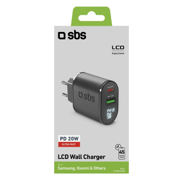 SBS TRAVEL CHARGER LCD 2 PORTS USB/TYPE C PD 20W black